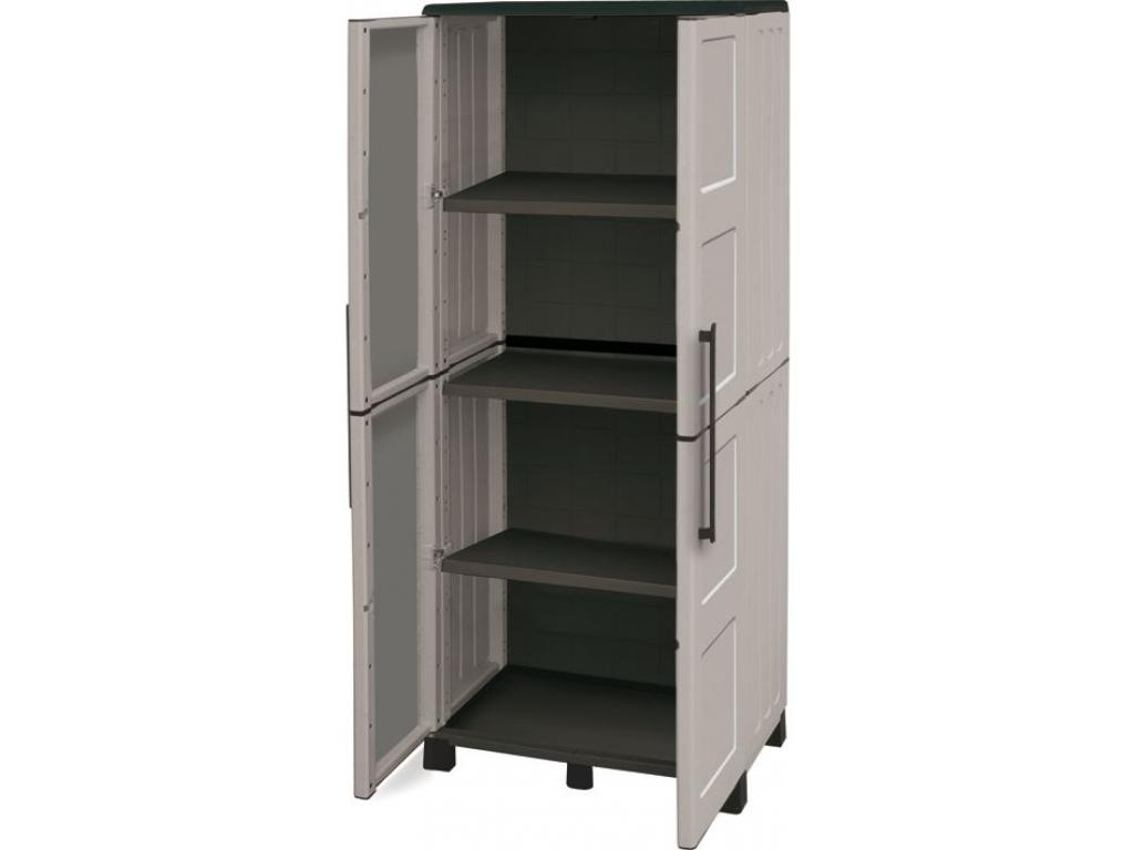 Armadio per interno e esterno con sistema antiusura, porte e scaffali interni regolabili, cerniere con chiusura a scatto in acciaio, struttura in polipropilene copolimero con piedi. COLORE GRIGIO CHIARO.